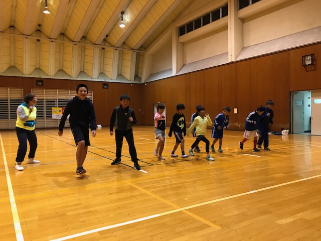 11/17(金) ジュニア体育教室 13名参加。ランニングフォームを意識して、腕の振り、脚の運びといった基礎の反復から、ラダーを使っての様々なステップを行いました。体(上半身と下半身)をうまく使うこと、関節の可動域を広げること、体のバランスを保つこと…脚が速くなるための基礎をしっかりとやれました!
