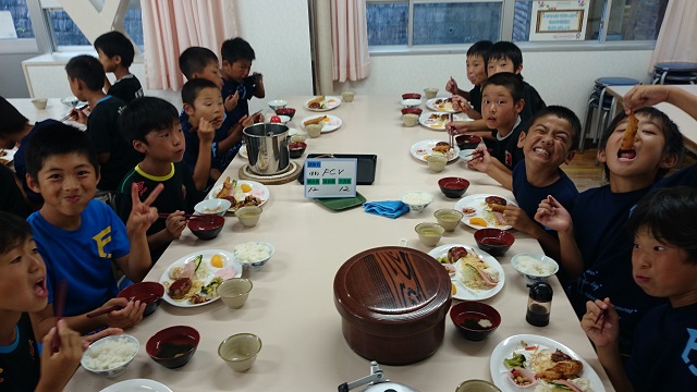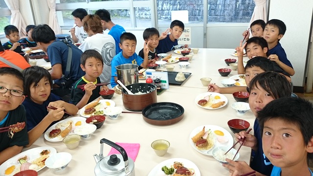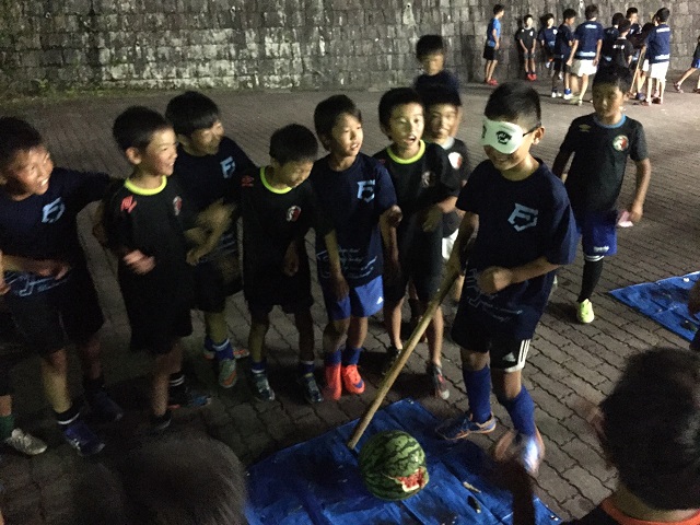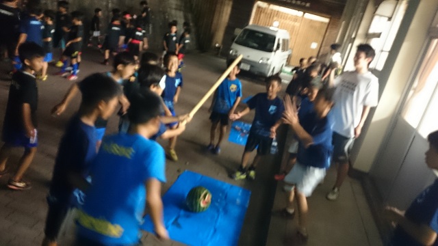サマーキャンプ2015in彦根 ② 食堂での夕飯。いつもとは違う仲間との食事は美味しかったかな? 食事の後にナイトハイクして(肝試し)すいか割り!! なめてましたね、すいか割りを。 こんなに楽しいとは思いもしなかった(^^)v ナイトハイク後のこどもたち。非常にテンション上がってました(^^)